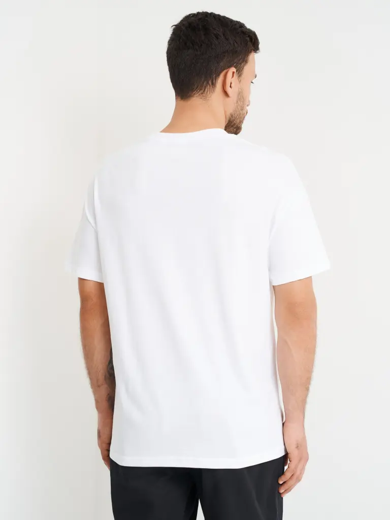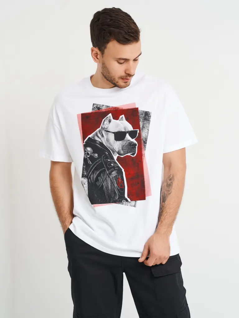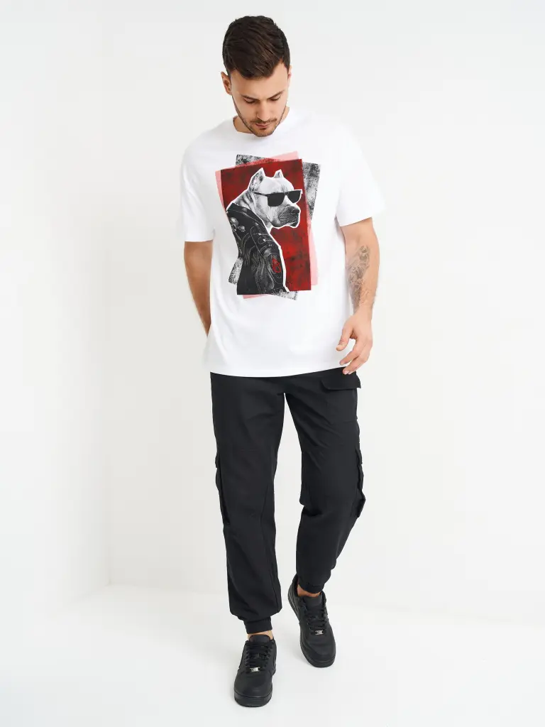 Футболка мужская, свободного кроя, с круглым вырезом и короткими рукавами. Модель из хлопка однотонного цвета, с принтом впереди. Такая футболка станет доминантой повседневного аутфита с брюками или джинсами, придавая ему брутальный характер.