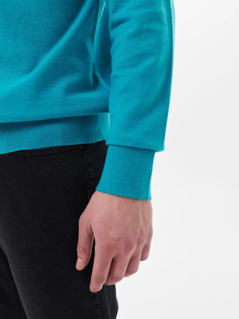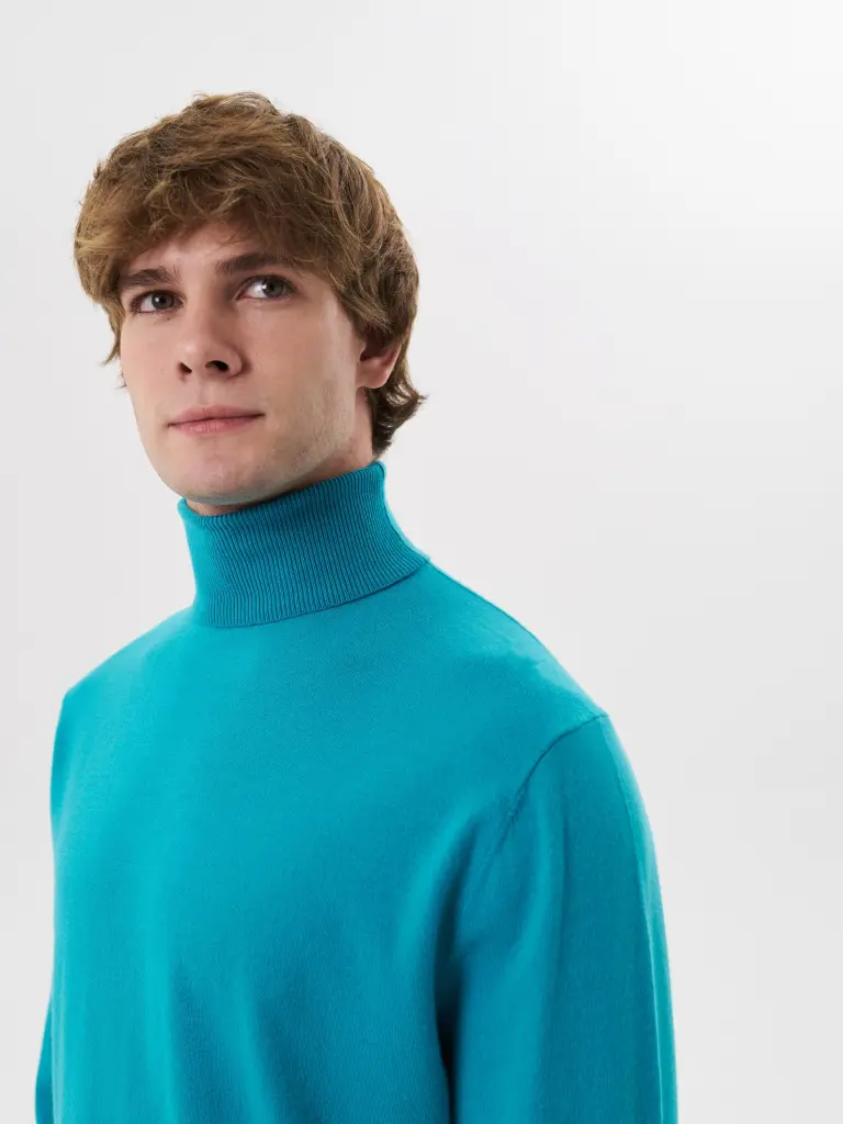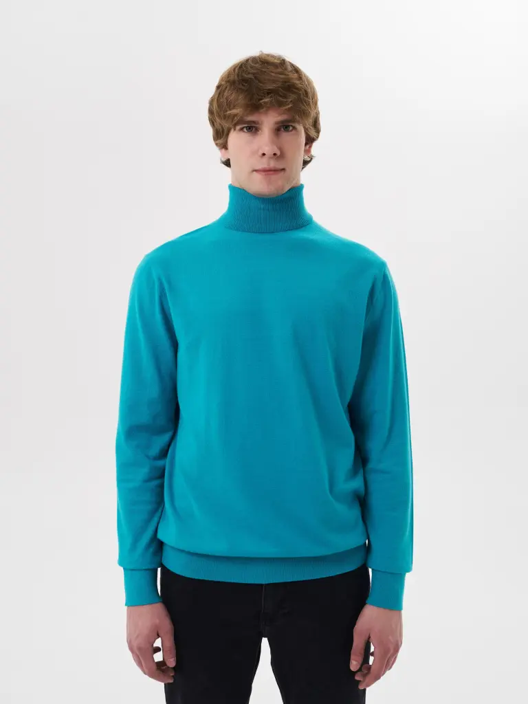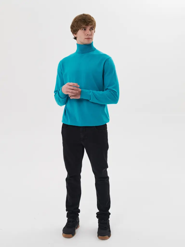 Свитер мужской базовый, с высоким горлом гольф и длинными рукавами. Однотонная модель из смешанного трикотажа с вискозой. Такой свитер станет универсальной покупкой, поскольку можно носить его в разных по стилю аутфитах: от классики до casual и джинсовых сетов.