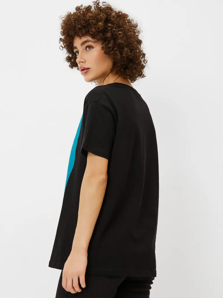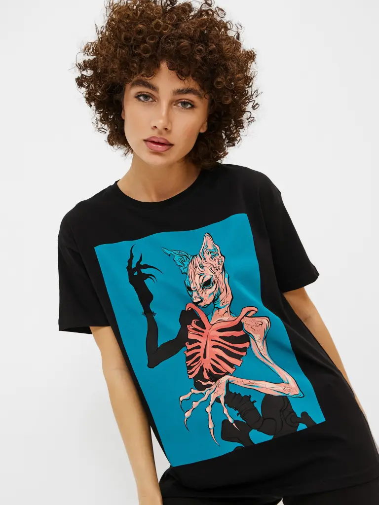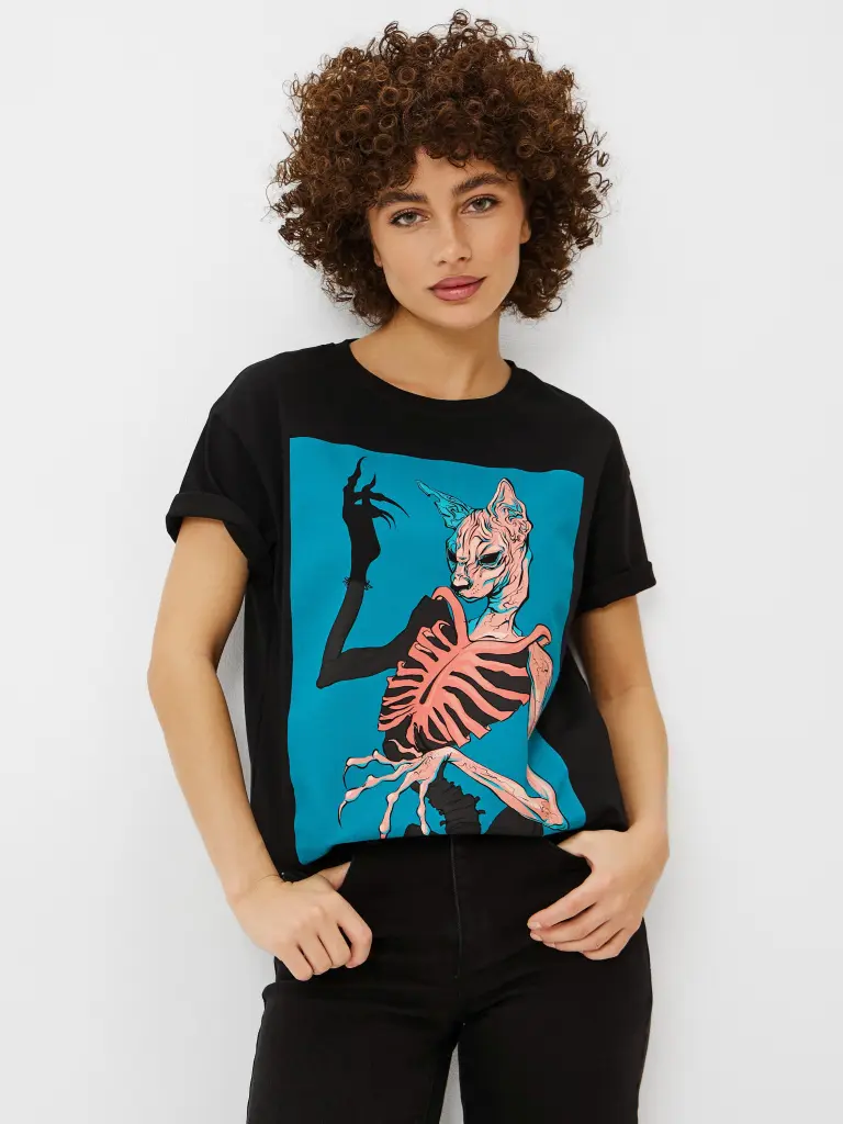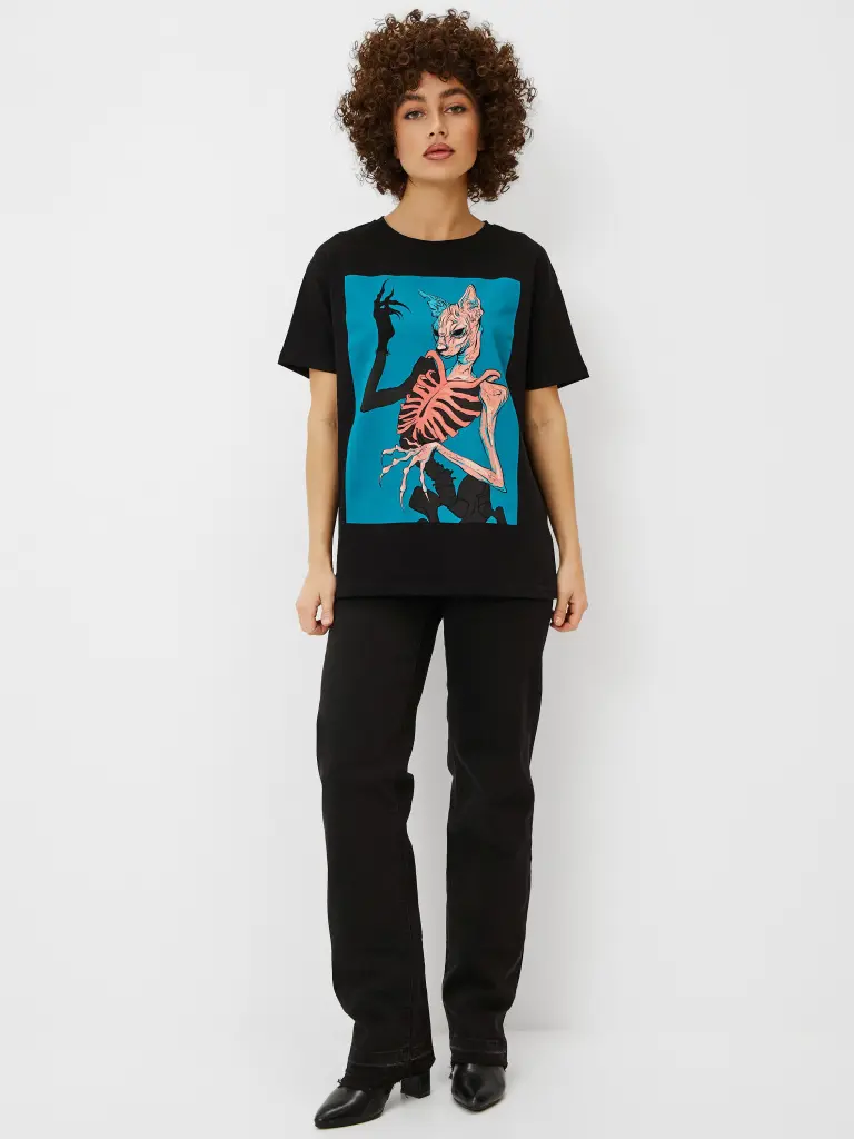 Футболка женского, свободного кроя, с круглым вырезом и короткими рукавами на приспущенном плече. Модель из хлопка однотонного цвета, с принтом из серии Котомания. Такая футболка дополнит образы в неформальном стиле с брюками, юбками или джинсами, став их эффектным центром.